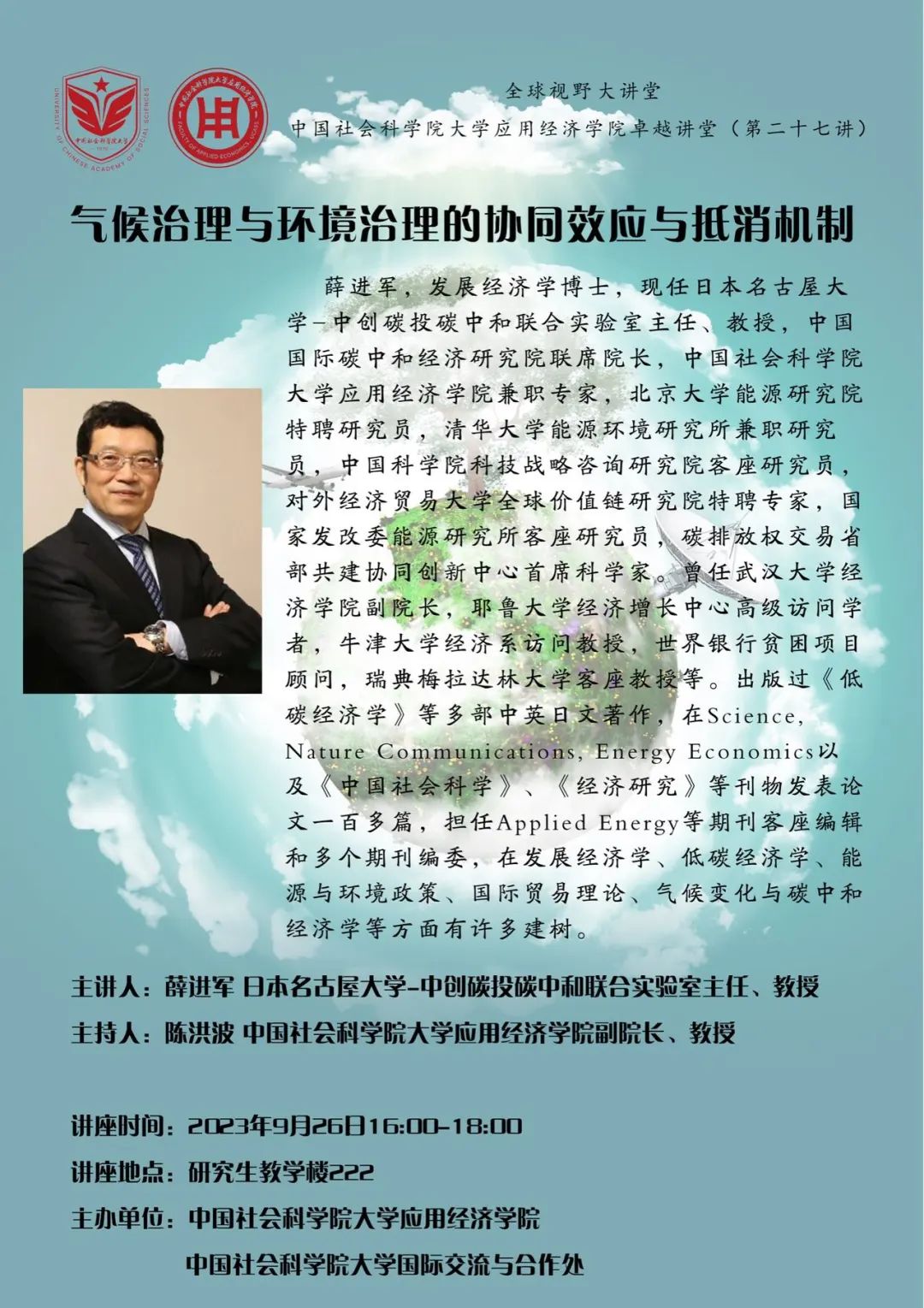 讲座预告|卓越讲堂第二十七讲 薛进军:气候治理与环境治理的协同效应与抵消机制