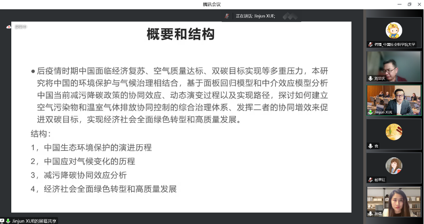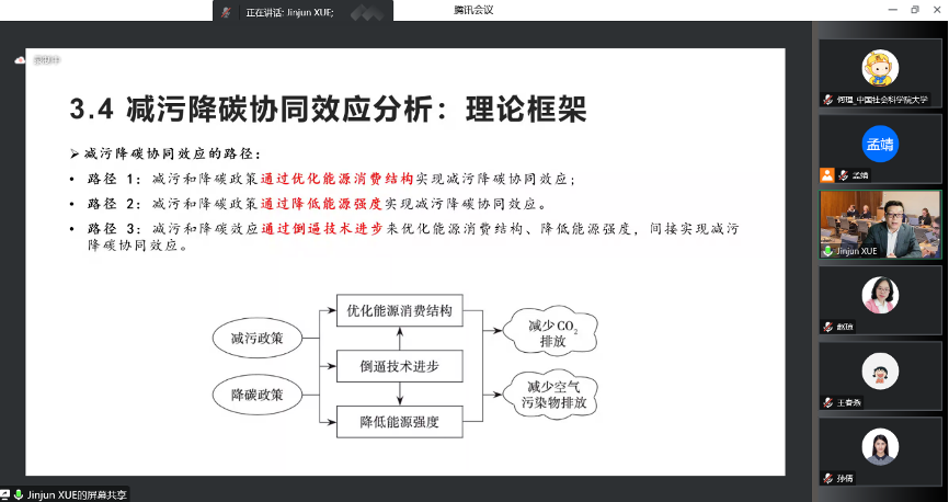 在讲座的第一部分,薛进军教授首先介绍了研究小组各位成员的基本情况和研究贡献。随后,西南石油大学经济管理A漫 的博士研究生孙倩介绍了我国生态环境保护政策和应对气候变化政策的演进历程。我国生态环境保护的政策建设历程包括三个阶段,分别为搭建环境治理框架阶段、点源控制向区域治理扩展阶段、环境治理能力纳入现代化国家治理体系阶段。在应对气候变化方面,我国从2007年至今已发布多项政策,并规划在2030年前实现“碳达峰”、在2060年前实现“碳中和”。因此,如何实现减污降碳协同增效已成为我国“双碳”战略下的重要研究课题。
