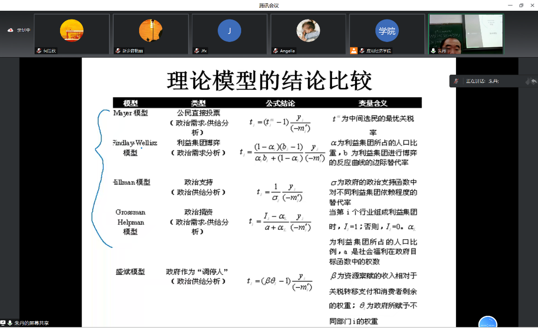 接着,王教授向同学们介绍了新政治经济学的概念以及公共选择理论。新政治经济学是一种应用于分析政治行为和制度的经济学方法体系。作为其中的核心理论,公共选择理论是指把人类的经济行为和政治行为作为统一的研究对象,从实证分析的角度出发,以理性经济人为基本假定和前提,运用微观经济学的成本—效益分析方法,解释个人偏好与政府公共选择之间的关系,研究作为投票者的消费者如何对公共物品或服务的供给决定表达意愿。贸易政策的政治经济学也就是将公共选择的分析范式嵌入传统的贸易理论,从政策决策过程的视角来探究贸易干预的水平、结构、形式和变化。