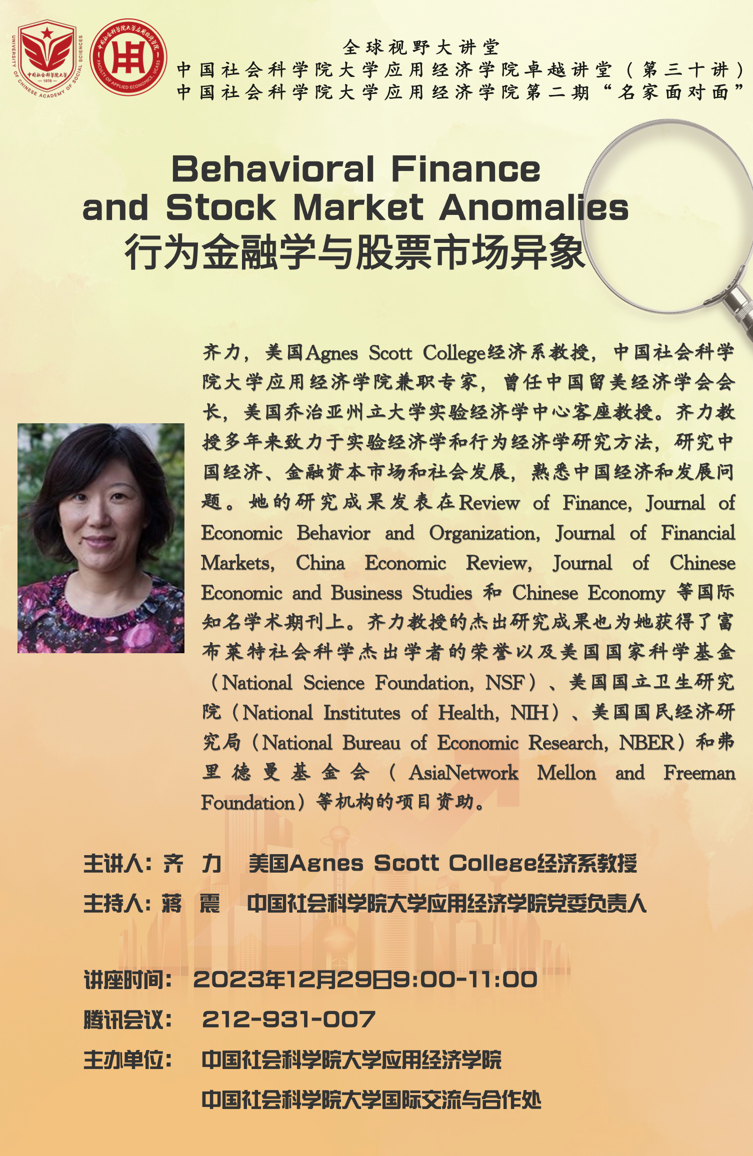 卓越讲堂第三十讲预告|齐力:行为金融学与股票市场异象