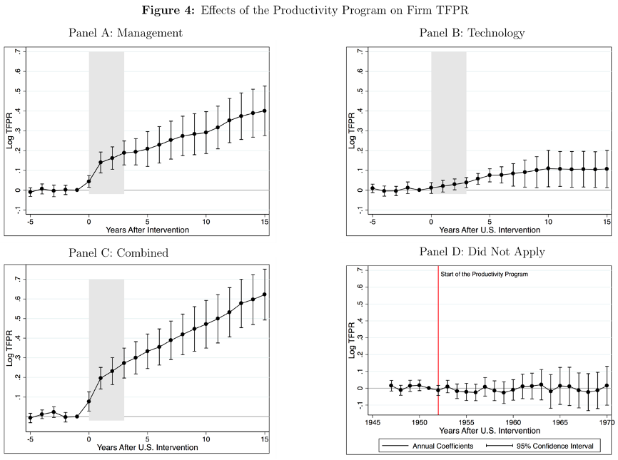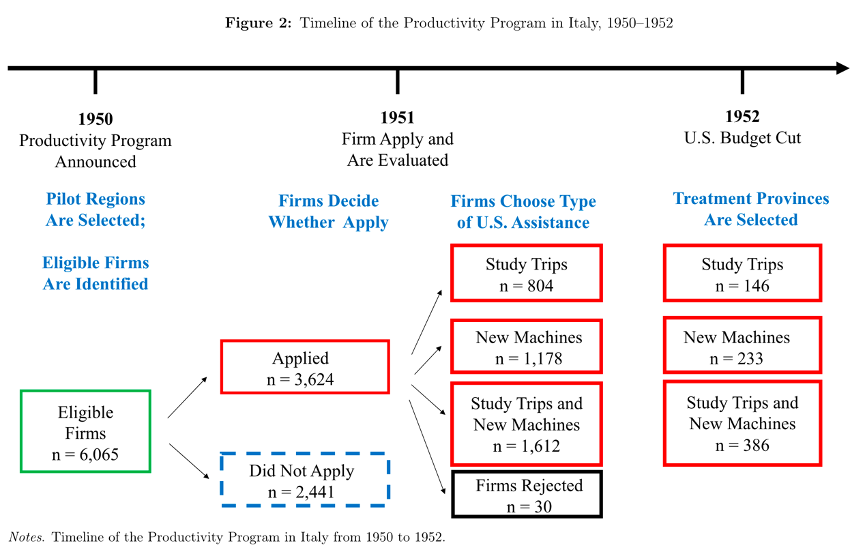 因果识别是进行DID的重要目的,处理组和控制组的结果变量需具有相同的潜在趋势则是识别的重要假设,因此使用DID前应当进行平行趋势检验和安慰剂检验。平行趋势检验的要点在于,应当选择尽可能多的前置时期,选择的时间段过短可能影响模型的可信度。安慰剂检验,又称假设在某个时间点发生了某事件或政策变化,而实际上并没有发生,然后对DID模型进行估计,检验系数是否显著。进行安慰剂试验至少需要政策前两期的数据。为讲解“理想的”平行趋势检验的例子,尤老师以Michela Giorcelli(2019)的论文(The Long-Term Effects of Management and Technology Transfers)为例。该文章的背景是1952至1958年马歇尔计划美国战后对意大利开展援助,处理组的中小制造企业企业可以申请该项目,并可以决定是否派遣他们的经理到美国(管理转移),购买美国的机器(技术转让),或者同时做(管理和技术转让相结合),以5到15年为区间,可以看出接受了管理培训和技术转移的企业具有更高的存活率。“生产力计划”选择的处理组省分和试点地区具有随机性,假设没有该计划,当年进行申请的处理组省份和控制组省份将会有相同的趋势。