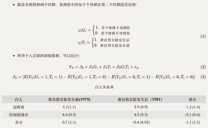 随后,尤老师以Card(1990)的论文(The Impact of the Mariel Boatlift on the Miami Labor Market)为例,介绍了DID及DDD的基本原理。根据Card,1980年马里尔升船事件使当年迈阿密的劳动力增加7%。若选取马里尔升船事件为一次准自然实验,以迈阿密为处理组,其他未受难民影响城市为对控制组,可以构建双重差分模型。估计结果显示,难民潮对迈阿密白人失业率的影响为-1.1%。