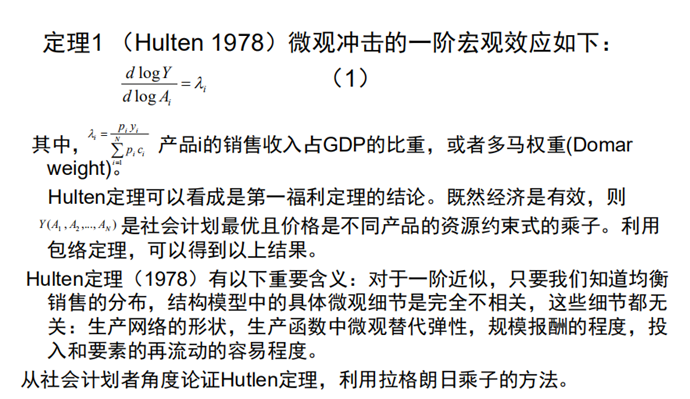 随后,倪老师向我们介绍了生产网络模型的发展脉络,主要介绍了早期的Hulten(1978)模型。Hulten (1978)证明在完全竞争的经济中,总生产率等于技术领域微观经济变化的多玛加权总和,这又被称为Hulten定理。虽然Hulten定理是生产率和增长核算的基石,但是倪老师也告诉我们这个定理也并非完美,在直觉层面上我们也有理由怀疑这个定理有违现实情况。老师也表明,生产网络能够给政策制定者提供新的思路和工具,能够有效地预测政策干预的经济后果,并为我们附上生产网络与金融、产业、贸易、就业等政策领域相关的前沿文献。