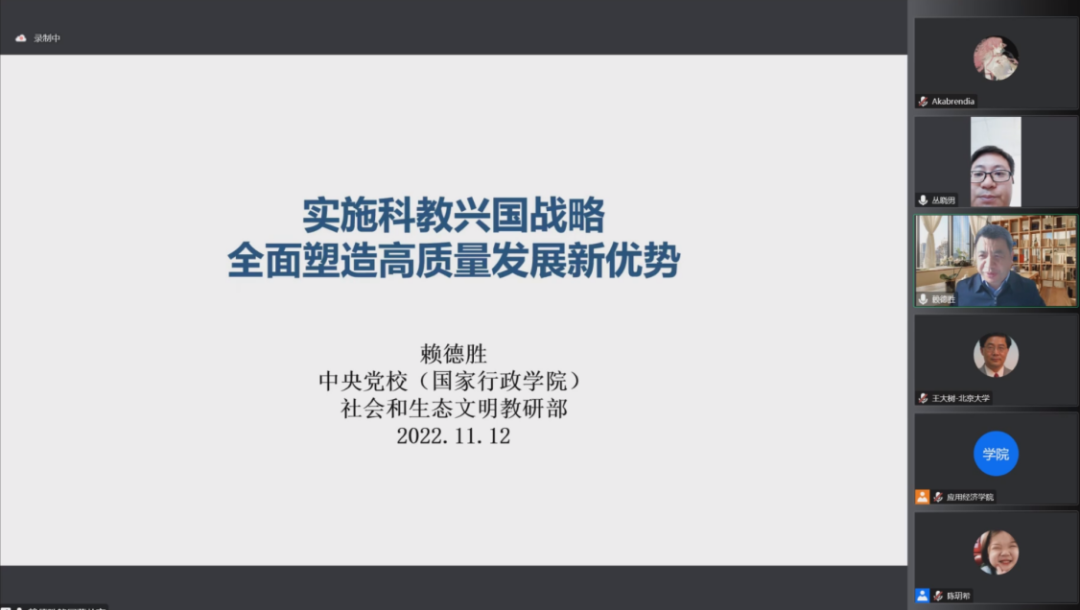 )社会和生态文明教研部副主任赖德胜教授演讲的主题为《实施科教兴国战略 全面塑造高质量发展新优势》。赖德胜指出,党的二十大报告凸显了教育在中国式现代化和高质量发展中的特殊重要作用,深化了对教育、科技和人才发展规律的认识。他强调,全面塑造高质量发展新优势,本质上就是要坚持创新在我国现代化建设全局中的核心地位。为此,必须深入实施科教兴国战略、人才强国战略和创新驱动发展战略。赖德胜就如何深入实施科教兴国战略提出了三点建议:首先,必须增强教育体系对科技进步、产业结构转型升级和人力资源市场变革的适配性。其次,必须将教育与人才、科技创新等更好地贯通起来,实现一体化发展,从而优化人才和人力资本配置。最后,要深化人才发展体制机制改革,用好用活各类人才。