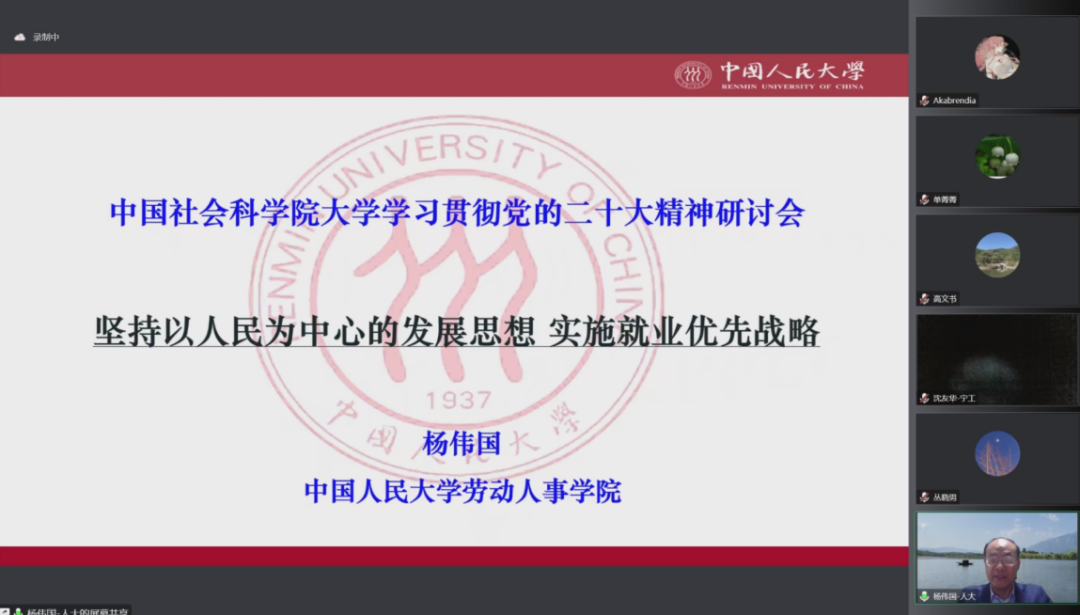 院长杨伟国教授演讲的主题为《坚持以人民为中心的发展思想 实施就业优先战略》。他指出,坚持以人民为中心的发展思想是我国经济发展的根本立场,而就业是最基本的民生。因此,要强化就业优先政策,健全就业促进机制,促进高质量充分就业。杨伟国详细阐释了就业范式在不同社会形态中的演进过程。随着人类社会由前工业社会逐步过渡到工业社会,就业范式也由人事匹配演变为人岗匹配。而进入数字社会后,新的人工匹配范式应运而生,提高了人力资本配置的自由度。他强调,范式认知、工作权利、工作机会、工作能力和工作保障是实施就业优先战略的着力点,必须牢牢把握。