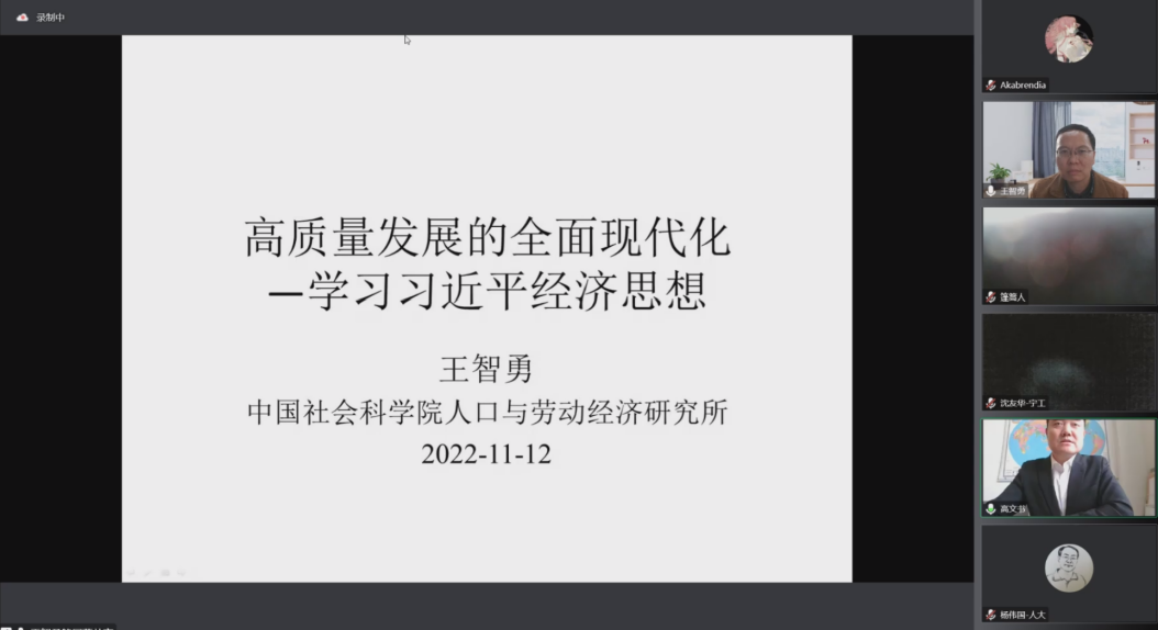 人口与劳动经济研究所人口经济研究室主任王智勇研究员以《高质量发展的全面现代化——学习习近平经济思想》为题发表演讲,主要从工业化和城镇化两个维度阐述了自己对高质量发展现代化的理解。王智勇指出,工业化是近代以来国家和地区经济社会发展的一个必然进程。他梳理了我国自近代以来工业化发展的曲折历程,并强调完整的工业体系对于国家和地区的经济发展具有极为重要的战略意义。随后他将视野转向了与工业化相伴而生的城镇化进程,对习近平总书记关于新型城镇化的重要论述进行了深入探讨。并结合丰富的数据和图表向我们展示了新中国成立以来,尤其是党的十八大召开之后,我国工业化和城镇化建设取得的丰硕成果。