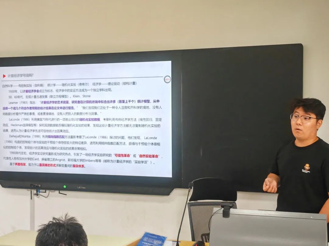 2021级数量经济学专业博士研究生,汇报主题为《网络基础设施、包容性绿色增长与地区差距——基于双重机器学习的因果推断》——《数量经济与技术经济研究》(2023年第4期)。他结合选题、文章写作过程、文章返修及其他投稿经历进行了汇报,并就双重机器学习进行了分享。
