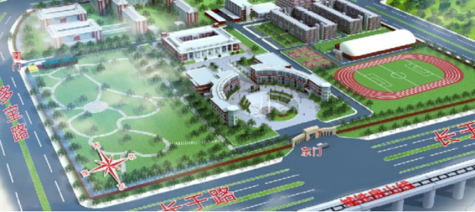 研教楼标已记为图中红色方框,位置正对学校东门。