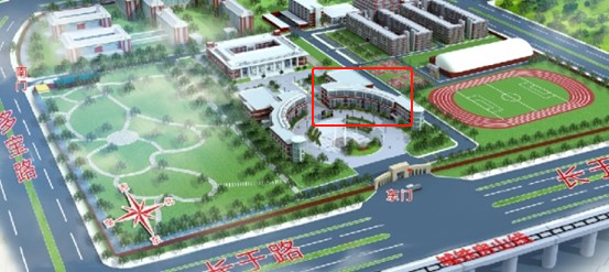 研教楼标已记为图中红色方框,位置正对学校东门。