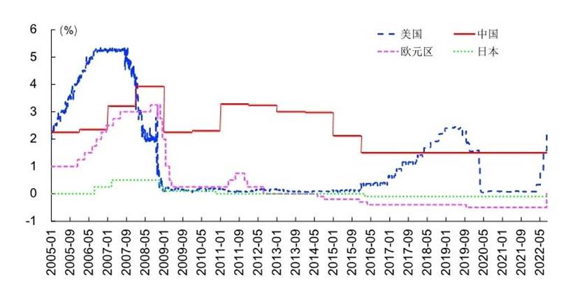 注:美国的政策利率指联邦基金利率,欧元区的政策利率指存款便利利率(欧洲央行公布的三大关键利率包括主要再融资利率、边际借贷利率和存款便利利率,考虑到三大关键利率走势基本相同,本文这里以存款便利利率作为欧洲央行政策利率的指示变量),日本的政策利率指超额准备金利率,中国的政策利率指一年期定期存款利率。