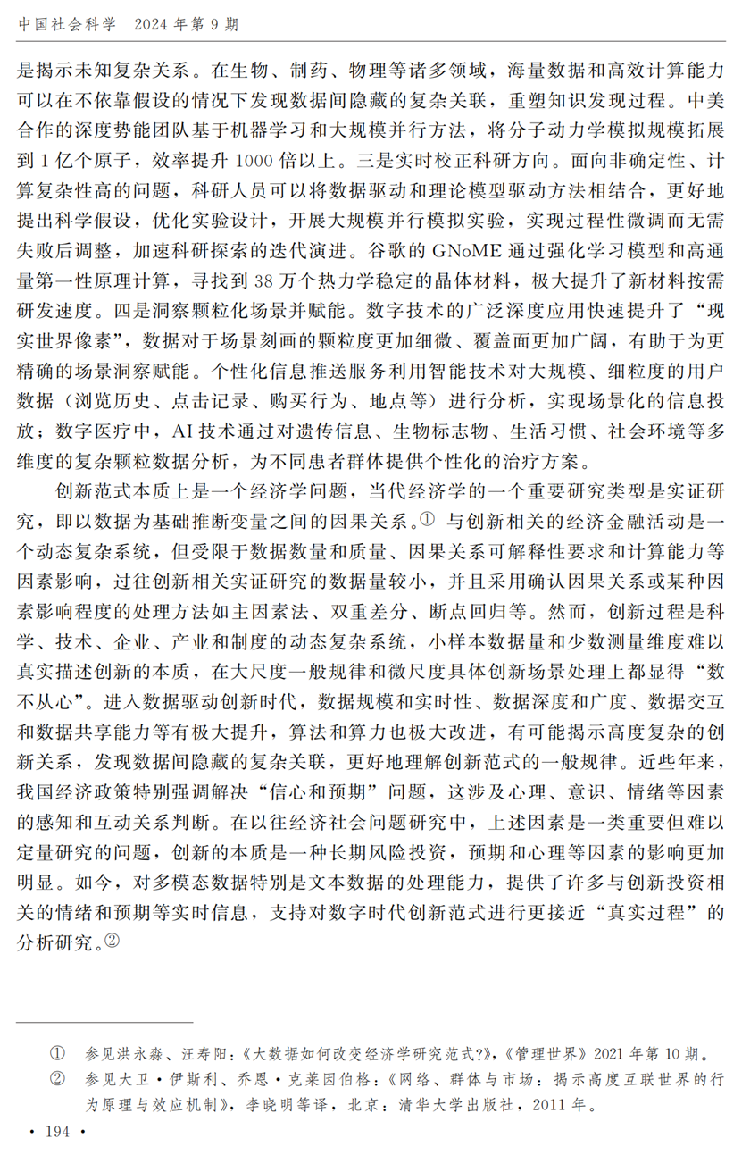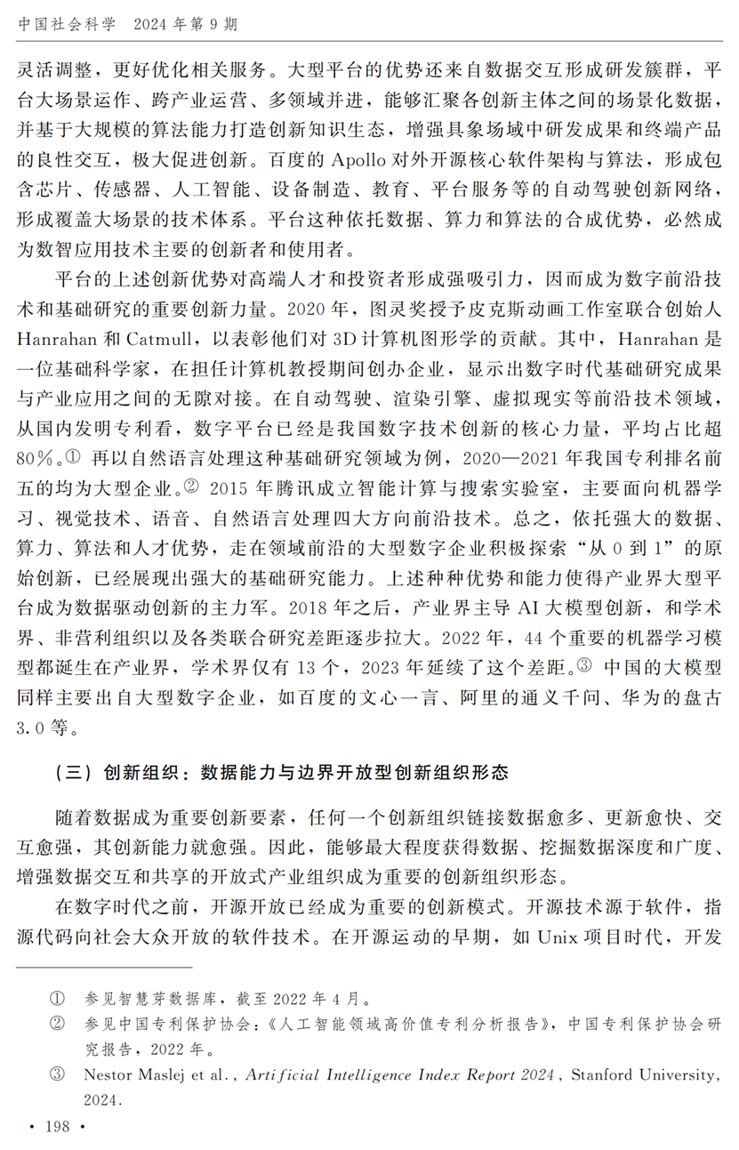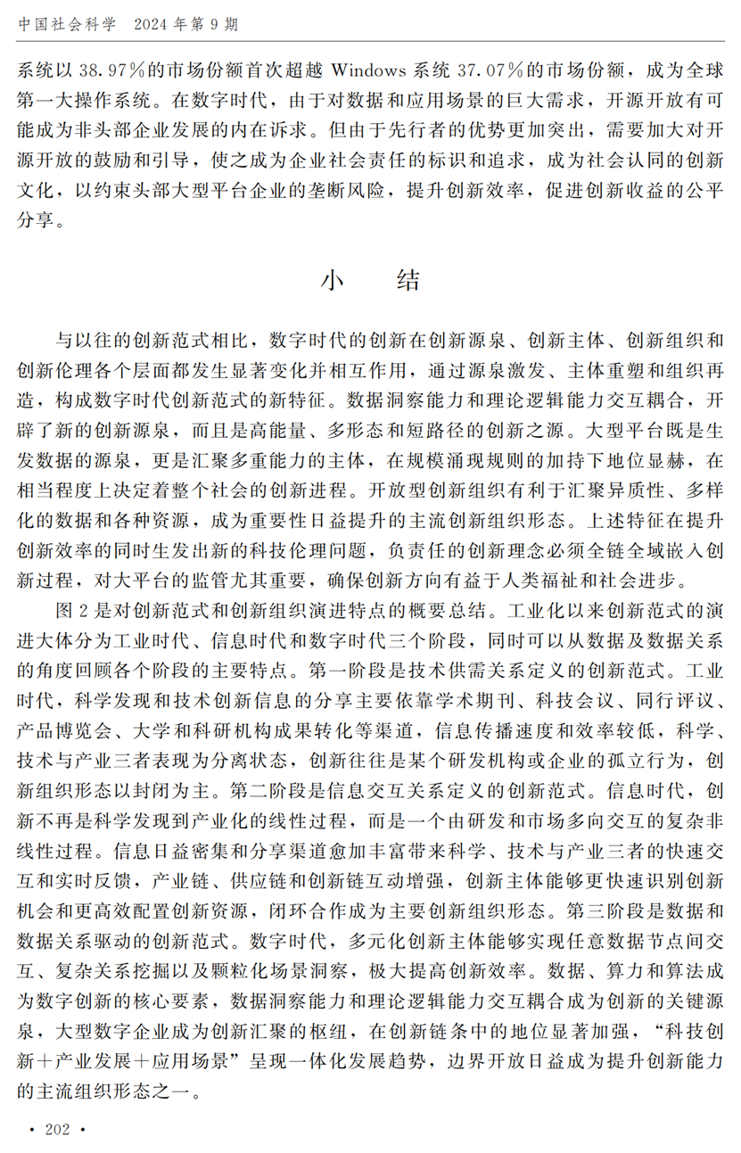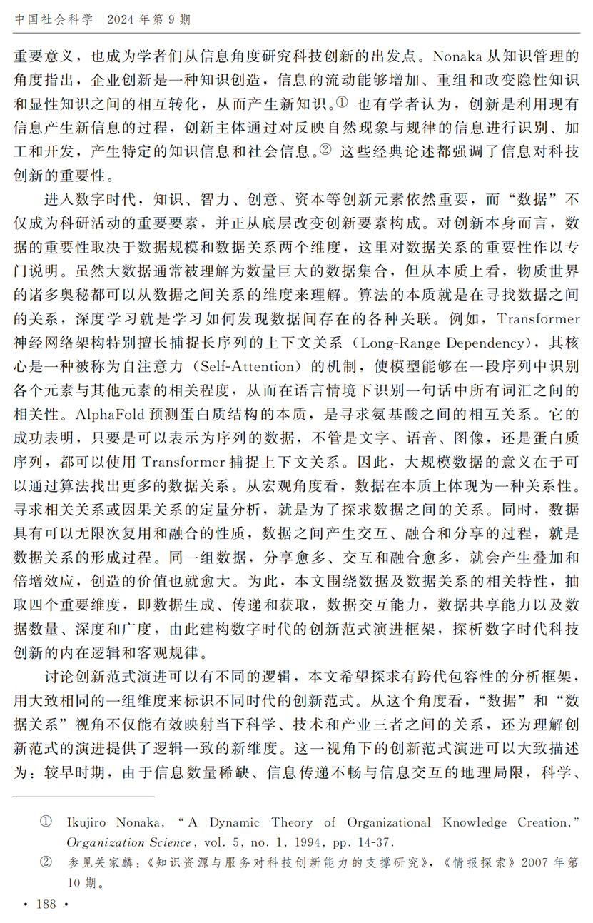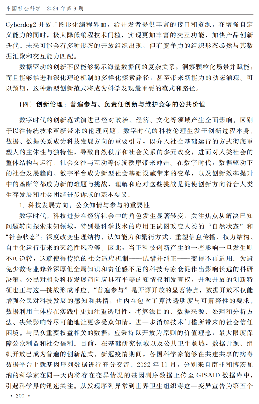 助理研究员李秋甫,合作于《中国社会科学》2024年第9期发表论文《数据、数据关系与数字时代的创新范式》。文章指出,在数据和数据关系驱动的创新范式中,数据洞察能力和理论逻辑能力交互耦合成为创新的关键源泉,规模涌现效应使得大型平台在创新链条中的地位显著前移并全面提升,开源开放式创新则是提升数据汇聚交互能力和优化创新资源配置的重要组织形态。数据和数据关系的重要性生发出新的科技伦理问题,进而对人类社会的传统秩序带来挑战。深刻理解和把握新的创新范式,对于深化创新理论研究、构建国家创新体系以及强化创新政策导向等意义重大。