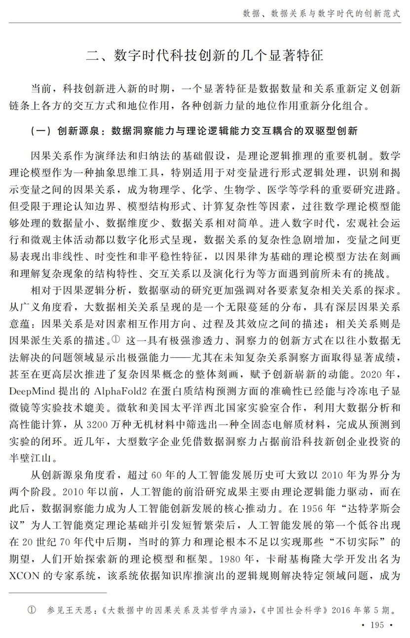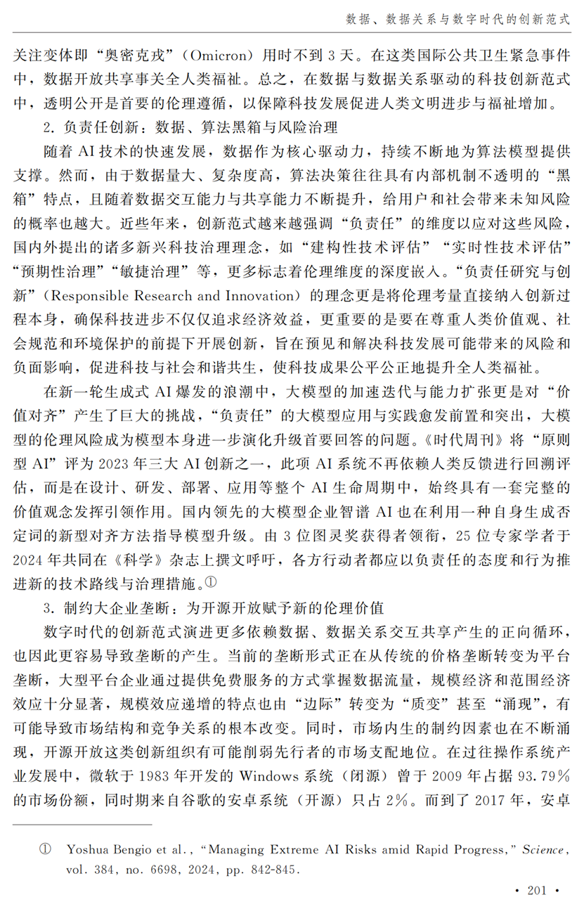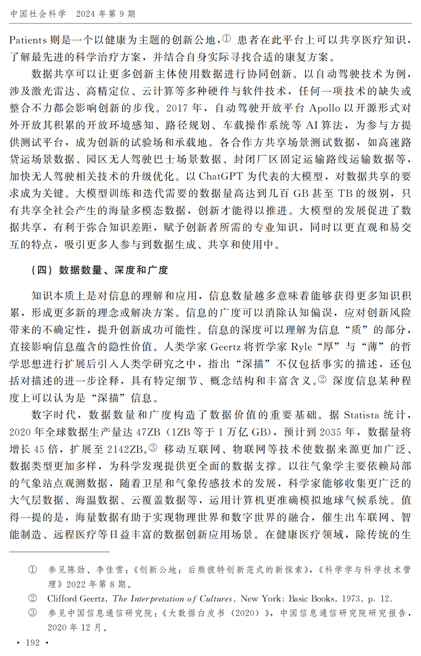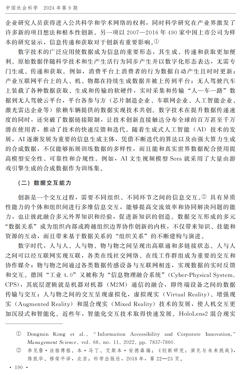 助理研究员李秋甫,合作于《中国社会科学》2024年第9期发表论文《数据、数据关系与数字时代的创新范式》。文章指出,在数据和数据关系驱动的创新范式中,数据洞察能力和理论逻辑能力交互耦合成为创新的关键源泉,规模涌现效应使得大型平台在创新链条中的地位显著前移并全面提升,开源开放式创新则是提升数据汇聚交互能力和优化创新资源配置的重要组织形态。数据和数据关系的重要性生发出新的科技伦理问题,进而对人类社会的传统秩序带来挑战。深刻理解和把握新的创新范式,对于深化创新理论研究、构建国家创新体系以及强化创新政策导向等意义重大。