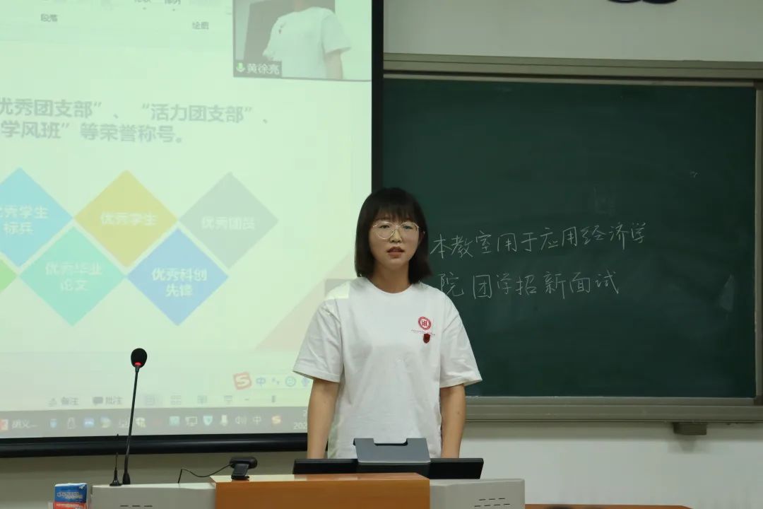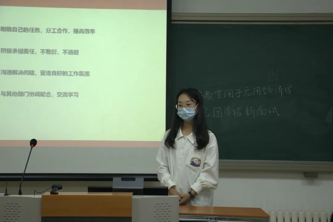 招新面试中,先由面试者进行2-3分钟的自我介绍,再由部门负责人提出与部门工作相关的问题,通过面试者的回答和临场应变能力来考察他们的工作能力和态度。有的同学通过PPT等丰富的形式向学长学姐们介绍自己,有的同学在回答问题的过程中结合自身学生工作经验,轻松自信地对答如流,同学们用诚恳的态度表达了对进入心仪部门、为同学们服务的态度。