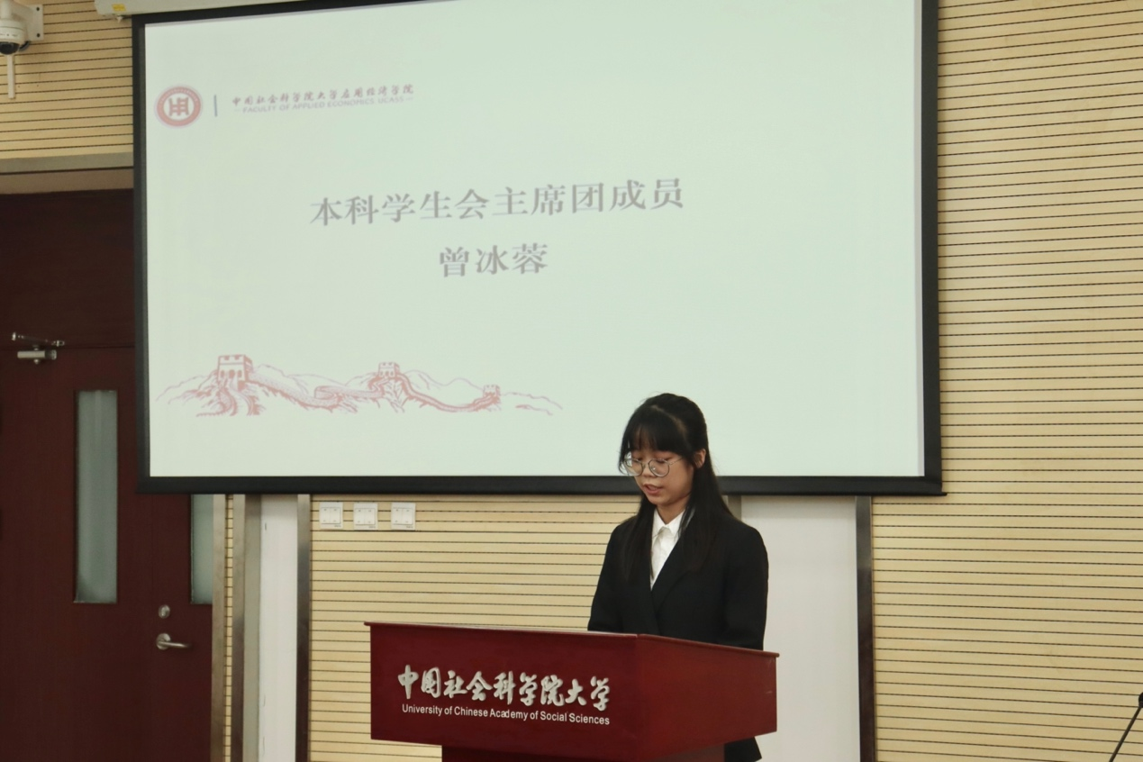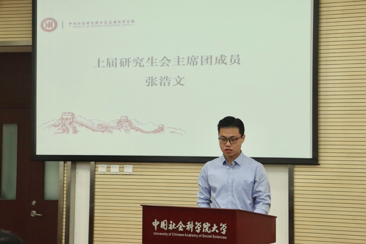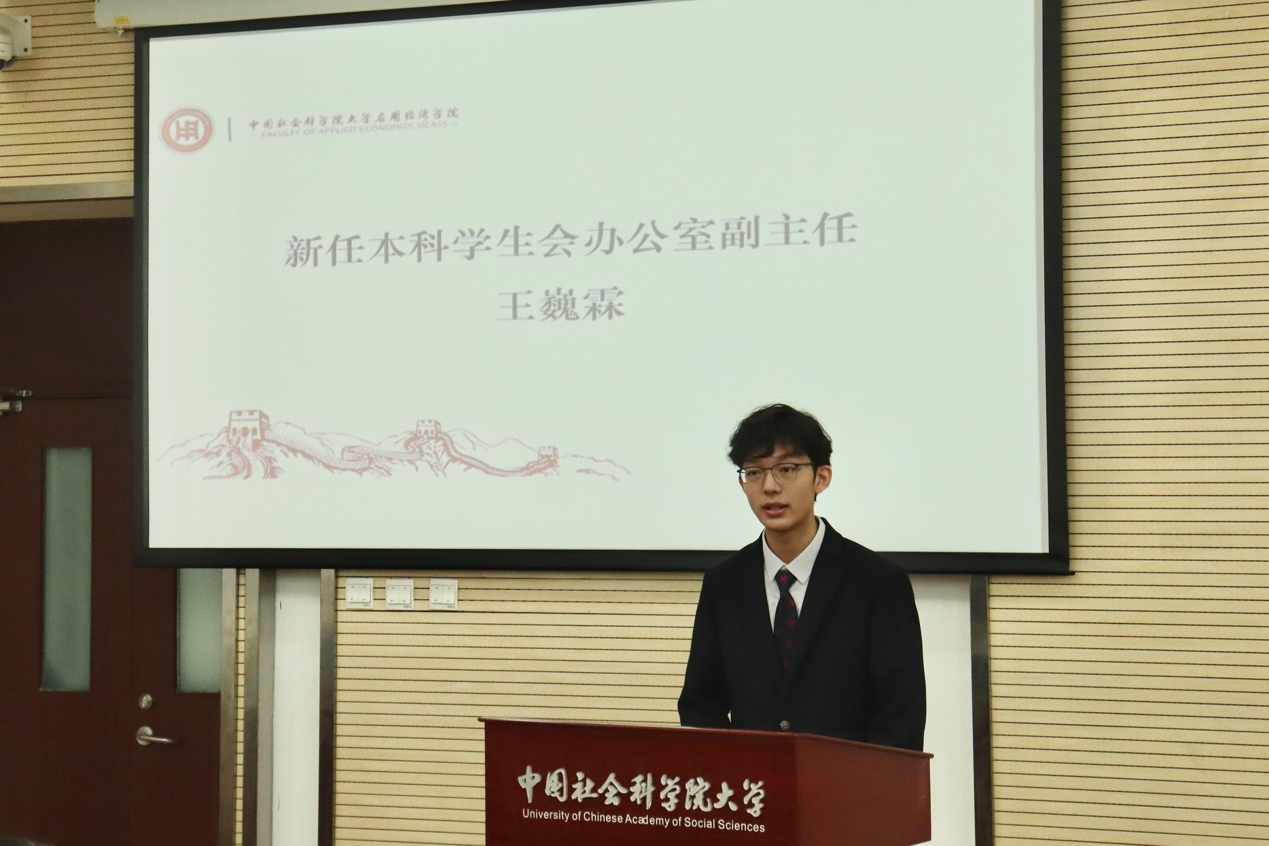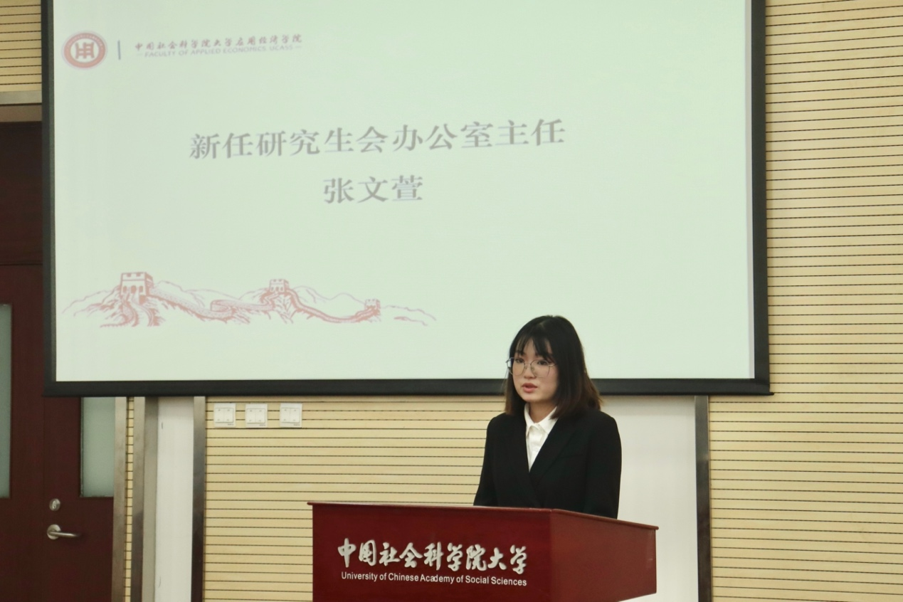张文萱在发言伊始分享了自己初入小院的憧憬和期盼,对学校和同学的关怀与帮助表示感激,对服务同学的学生工作充满向往和热情,她表示,“凡是过往,皆为序章”,在继承前人的工作基础下,作为新任办公室主任,在未来的研会工作中,她会做到如下几点:第一是做好工作,明确职责;第二是做好领导,团结合作;第三是做好桥梁,增进交流。