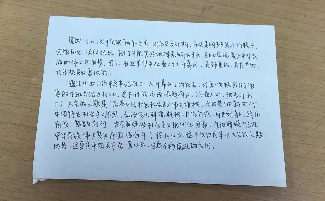 作为一名新时代的社科学子,我深感自豪和自信,深受鼓舞和鞭策。如何将自我投入时代激荡发展的洪流,如何提高自身专业能力为全面建设社会主义强国贡献绵薄之力,如何与党和国家一起拼、一起干、一起奋斗,是我需要深切思考的命题。新时代的青年人,理应夯实信仰,努力学习,在自己的专业领域扎实耕耘,在党和国家需要的地方奋发有为,让汗水与成果,激荡在属于我们自己的青春时代。