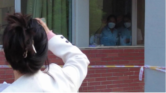 三号公寓工作人员与送花同学隔窗告别