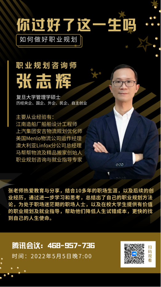 本周的分享会,将邀请职业咨询规划师——张志辉,通过自己多年的亲身经历,结合进一步的学习与思考,总结出一套科学的职业规划方法论,为每个在迷茫期的你指点迷津。