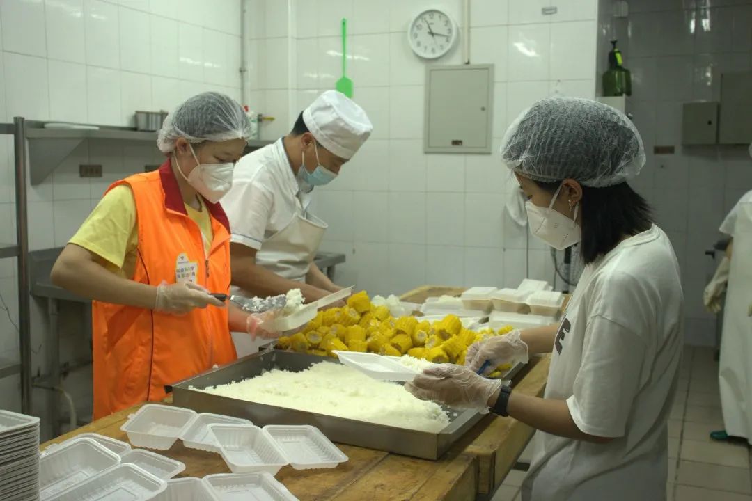 送餐数量多,但效率不打折。由负责人提前将各楼层的订餐信息分类整理,核定不同规格的普通餐和清真餐数量,再对接食堂负责人。第二日的接餐核餐、台面消毒、装盒打包、送餐,每个步骤都有条不紊,保证准时到达,着力捍卫同学们在疫情防控期间“舌尖上的安全”。