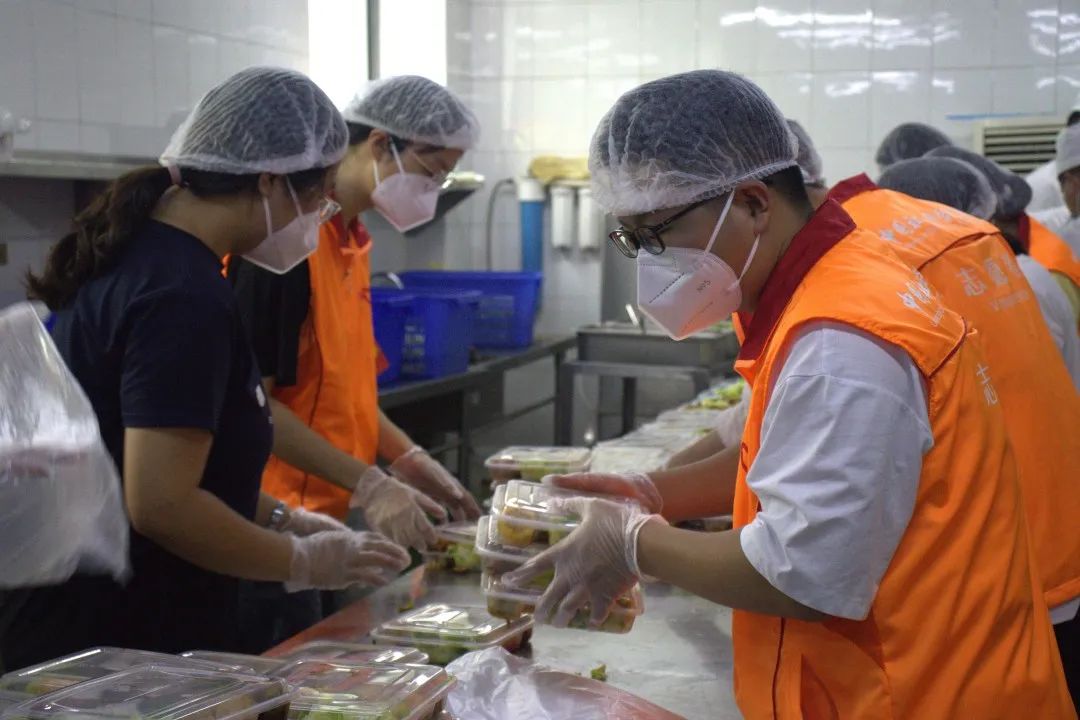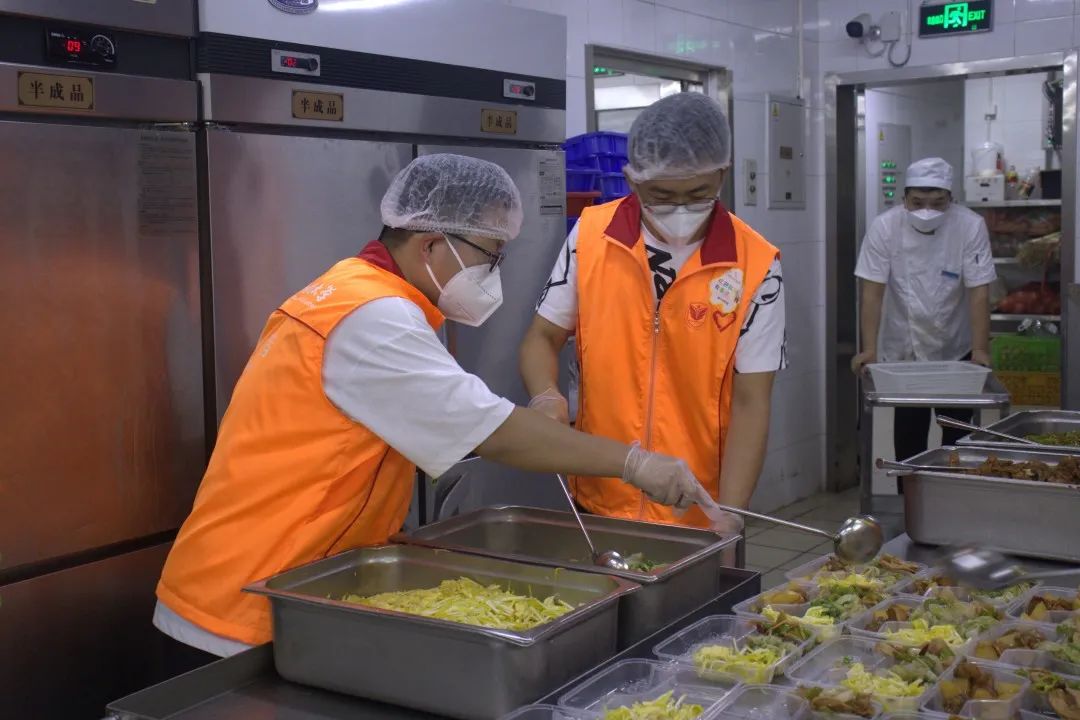 9月14日早晨,A漫送餐志愿者们在一食堂集合完毕。志愿者们穿好橙马甲,戴好口罩、头套和手套,全程严格按照疫情防控要求,完成每顿一千余份的无接触配送任务。