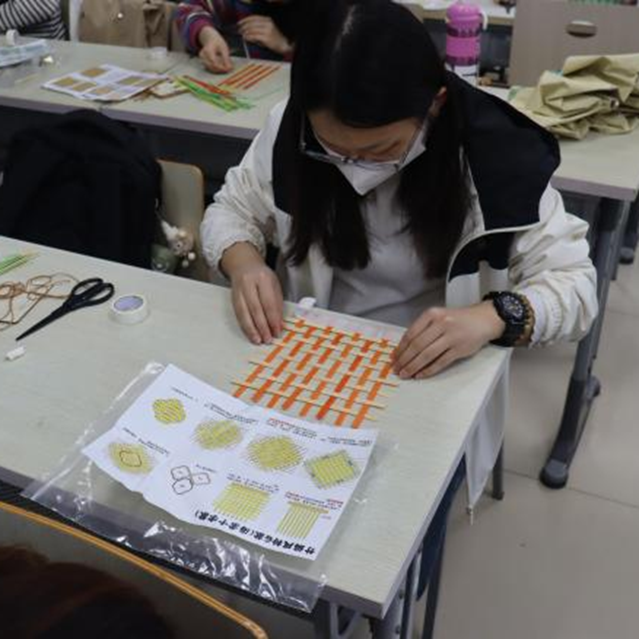 为每位参与者准备了专业竹编材料包,内含精选竹篾、彩色装饰线及全套工具,并配有详尽的制作指南。同学们从最基础的"挑一压一"编织法入手,一根根竹篾在灵巧的指尖穿梭,逐渐编织出整齐有序的纹理。活动现场洋溢着专注而愉悦的氛围,传统文化的种子在年轻的心田悄然生根。