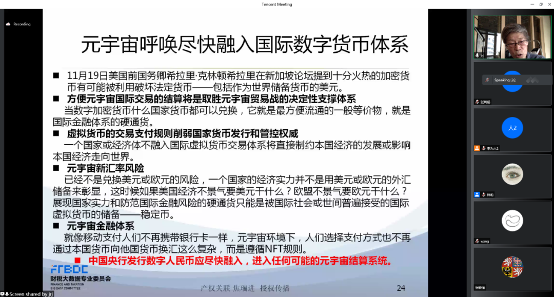 讲座的第三部分,焦瑞进老师指出,元宇宙新经济发展中一个显著的特点是新经济要素的交易是通过全球泛货币交易方式的发展呈现于现实,而这种国际交易最方便的结算货币将是取得元宇宙贸易竞争胜利的决定性支撑。