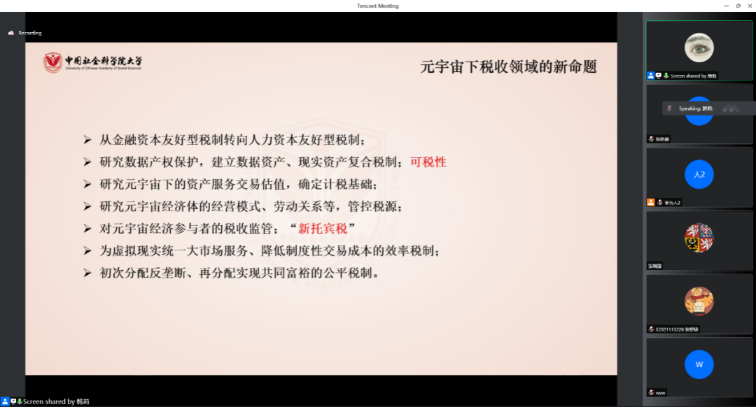 韩莉副教授则以“元宇宙下的经济学原理思考”为主题,结合2021级税务硕士研究生选题开题的现实需求,从微观经济学和宏观经济学角度揭示了元宇宙新经济的经济学原理,并且提出了诸如“新托宾税”、“数据产权可税性”等新的税收命题,对广大师生研究元宇宙新经济提供了方向指引。