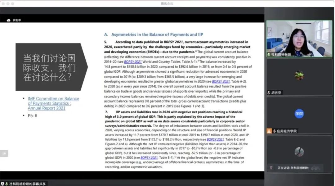 世界经济与政治研究所国际金融研究室副主任杨盼盼老师以“国际收支理论与政策”为主题与师生们进行了深入地交流。本次讲座由金融硕士教育中心副主任胡吉亚副教授主持。